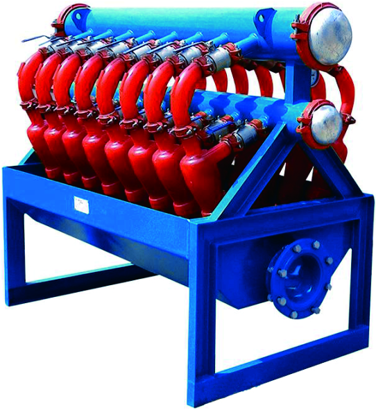 鉆井泥漿在除砂器倉經(jīng)過砂泵輸送到除泥旋流器中,在砂泵的壓力下,泥漿流的沖擊力下,鉆井泥漿在旋流器中形成旋渦狀而鉆井液中的固體在離心力和重力的作用下,沉降到旋流器底部,最后經(jīng)由滴流嘴噴射出來。固體顆粒會(huì)在底流篩進(jìn)行進(jìn)一步的篩分和過濾。而輕一些的,干凈的液體將通過旋流器組的排出管線直接流到除泥倉內(nèi)。除泥倉內(nèi)的液體會(huì)被離心機(jī)泵繼續(xù)供給離心機(jī)做第四級(jí)固控處理。