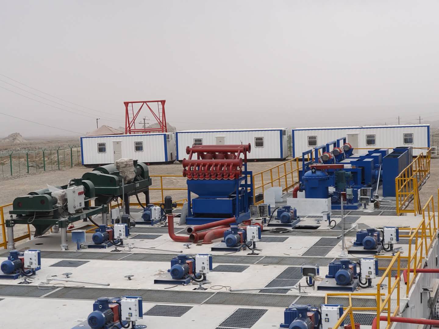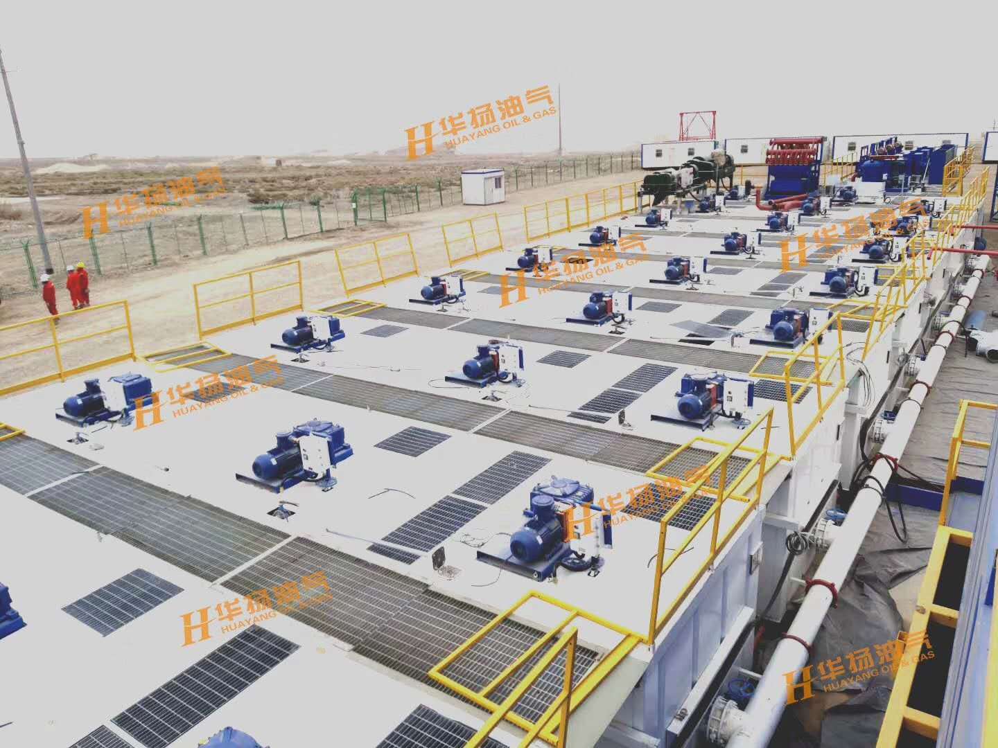 ZJ70-4500DBL鉆機(jī)配套固控系統(tǒng),包括了11具泥漿罐、HYZS703三聯(lián)振動篩、HYZCQ270真空除氣器、HYQJ250X3S-100X16N除泥除砂一體機(jī)、HYLW600中速離心機(jī)、HYLW350-1N高速離心機(jī)、HYJBQ15攪拌器、HYSLH150-50雙加重系統(tǒng)、HYJQH150-50剪切混漿系統(tǒng)等設(shè)備。