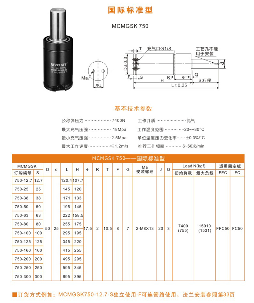 米蘇米MICMI五金塑膠模具壓縮氮氣彈簧 “MCMGSK750國際標準型” 多行程廠家直銷