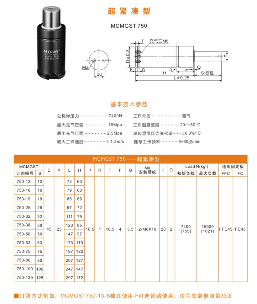 米蘇米MICMI五金塑膠模具壓縮氮氣彈簧 “MCMGST750超緊湊型” 多行程廠家直銷